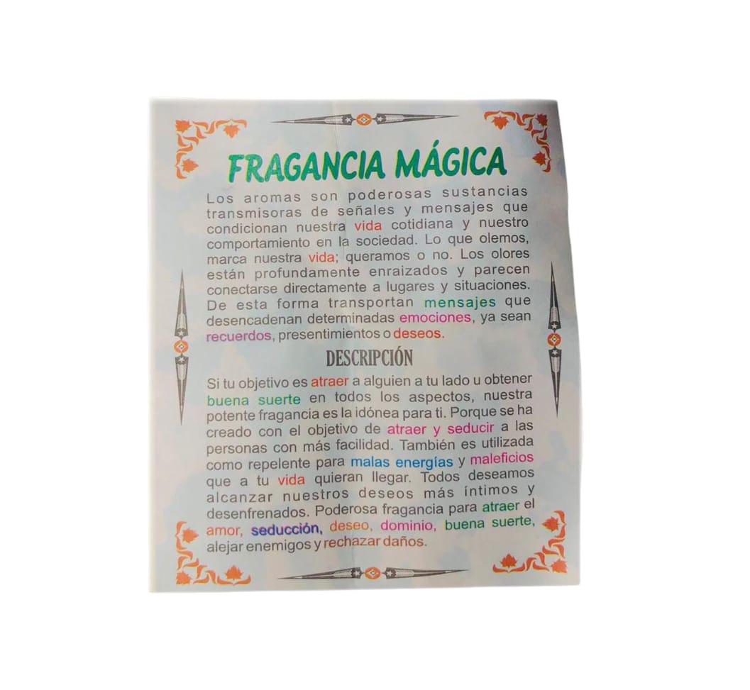 Si tu objetivó es atraer a alguien a tu lado o obtener BUENA SUERTE en todos los aspectos, nuestras potente fragancia es la idónea para ti. Por que se ha creado con el objetivo de atraer y seducir a las personas con mas facilidad. También es utilizada como repelente para malas energías y maleficios que a tu vida quieran llegar. Todos deseamos alcanzar nuestros deseos mas íntimos y desenfrenados. poderosa fragancia para atraer el AMOR, SEDUCCION, DESEO, DOMINIO, BUENA SUERTE, alejar enemigos y rechazar daños.